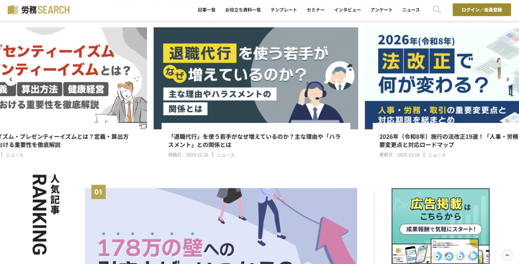 「労務SEARCH」は、労務・人事・総務管理者が抱える悩みや疑問を解決するための専門メディアです。主に以下の3つのカテゴリーで構成されています。