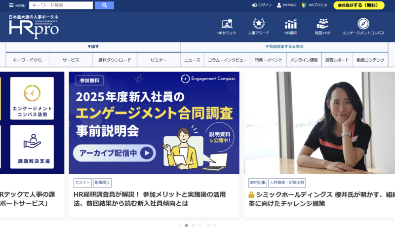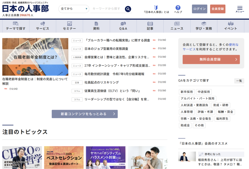 「日本の人事部」は、採用、育成、労務管理などの問題に悩むビジネスパーソンに向けた人事総合メディアです。イベントの開催や出版、専門情報などを提供しています。主なカテゴリーは以下です。