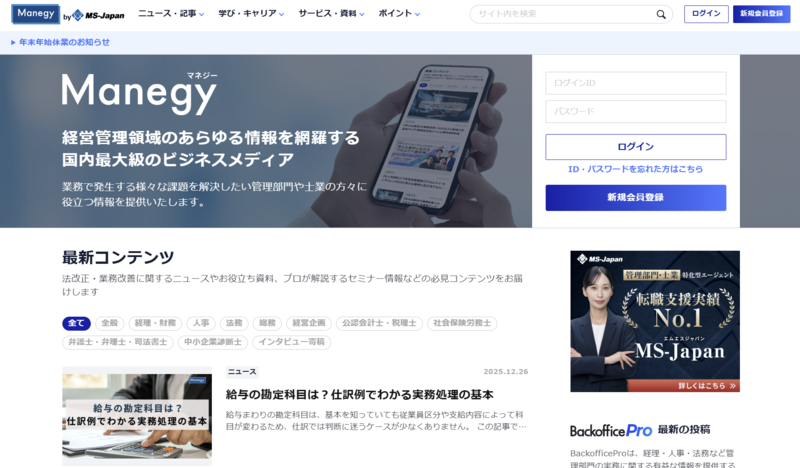「Manegy」は、経営管理領域の情報を網羅するビジネスメディアです。業務で発生するあらゆる問題を解決したい管理部門、士業の方向けの情報を提供しています。主に以下のカテゴリーで構成されています。